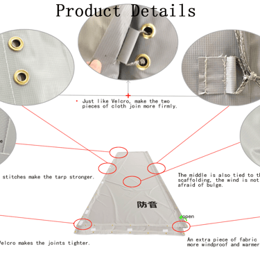 When in use, it is bound outside the scaffold and the extra edge covers the gap between parts to make the building as a whole sealed, playing the role of sound insulation, dust prevention, sand prevention, wind prevention, fall prevention, winter heat preservation and other safety protection