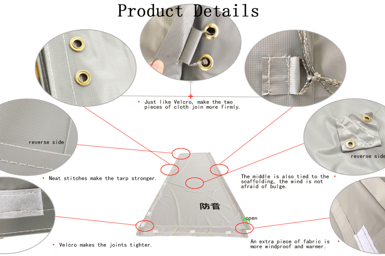 PVC Soundproof Tarpaulin is made of PVC laminated fabric or pvc coated fabric, usually used as protection parts in scaffolding system, which has functions of flame retardant, noise barrier , dust-proof, wind-proof.